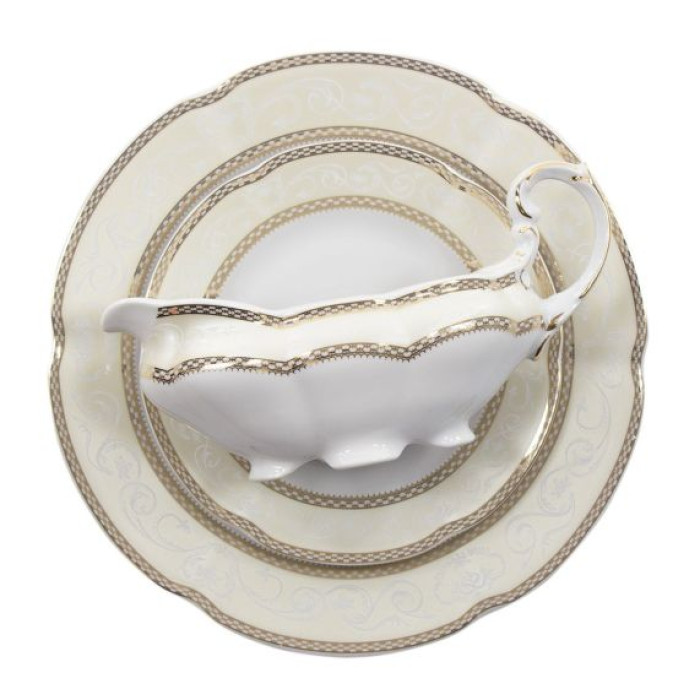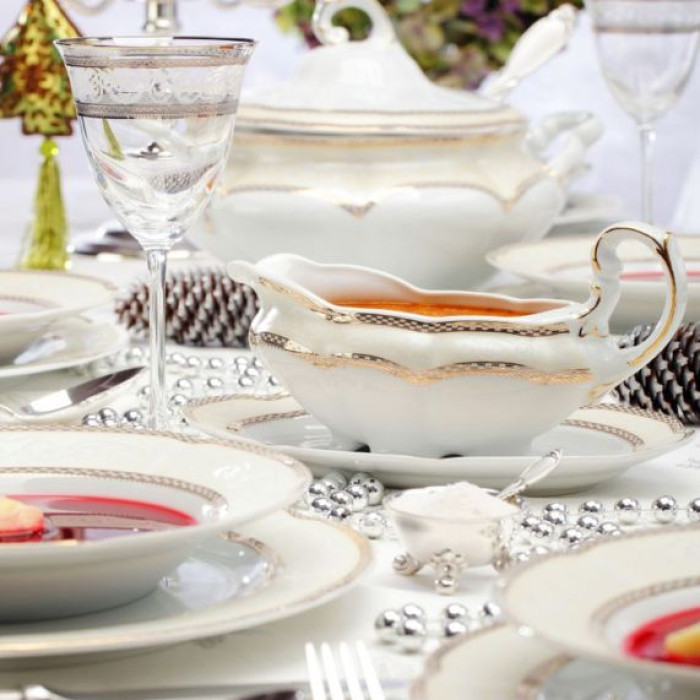 Ніжна біла порцеляна прикрашена чарівним золотим декором, натхненним віденським стилем, який надає сервізу шляхетності найвищого рівня. Класична форма Bolero вражає своїми лініями, що відсилають до рококових мотивів. Цей обідній сервіз на 6 осіб, що складається з 25 елементів, ідеально доповнить сервірування столу під час особливих подій, створюючи атмосферу розкоші та гарного смаку.